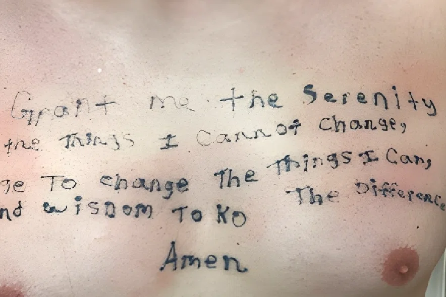 It happened on one of those nights, too many drinks, impulsive choices, and a buddy who thought he could tattoo. By sunrise, the words of a prayer were shakily inked across Andrew’s chest. It wasn’t straight, it wasn’t well done and it wasn’t something he ever wanted.
